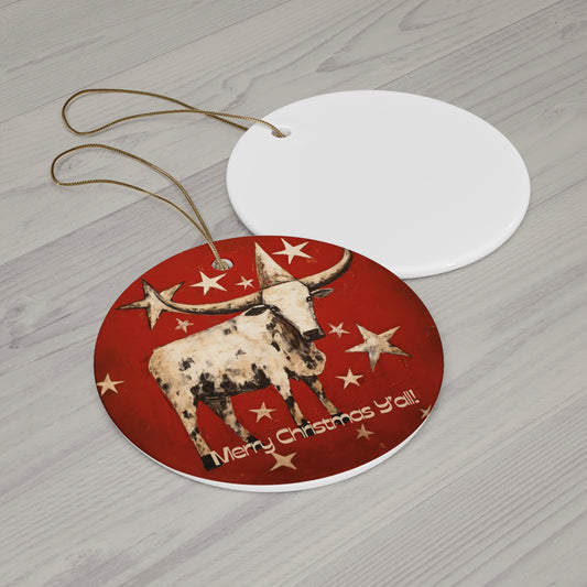 Texas Longhorn Cattle Stars Christmas Greeting "Merry Christmas Y'all!" Ceramic Tree Ornament. Happy Holiday Southern Style Greeting Gift