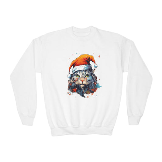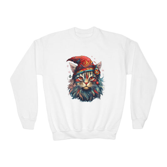 Santa's Cat Elf in Santa Hat, Kids Sweatshirt - Adorable Kids Youth Crewneck Sweatshirt -Christmas Cat Wizard Gift