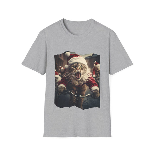Screaming Cats on Bikes Holiday Christmas Cat Shirt, Cat Lover's Graphic Tee Graphic Unisex T- Shirt, T-Shirt Cat Lovers Gift Softstyle T-Shirt Tee Christmas JumperTeeshirt Stylized Cat