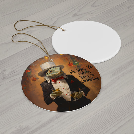 Lizard Iguana Art Gift, Reptile Lover Gift Christmas New Years Drinking Gift, Happy Hour Cocktails Ceramic Ornament- He Sees You Drinking