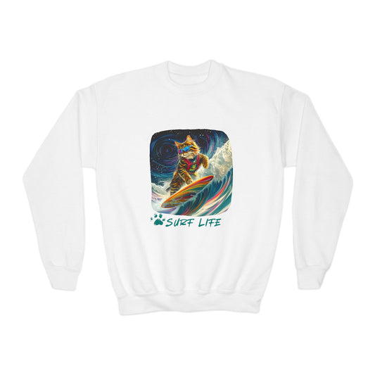 Surf Life Surfer Cat for Kids Sweatshirt - Kitty Cat Shredding the Weves-Youth Crewneck Sweatshirt -Christmas Cat Gift