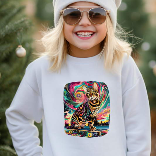 Skatboard Cats for Kids Sweatshirt - Psychedelic Skateboard Cat Youth Crewneck Sweatshirt -Christmas Cat Gift