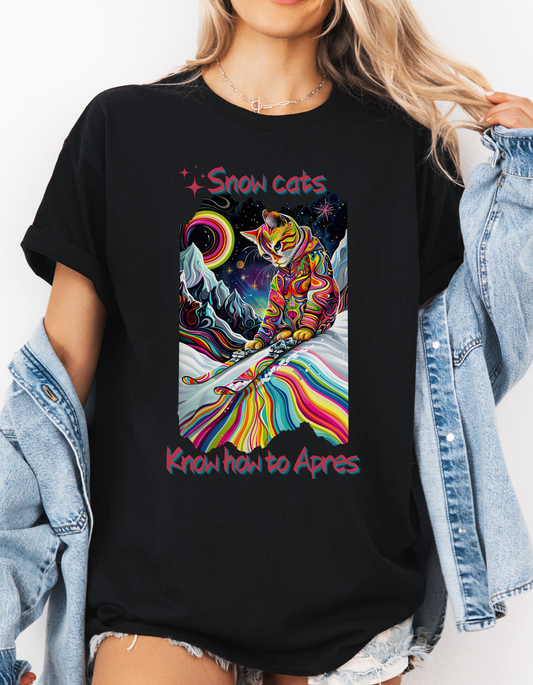 Snow Cats Know How to Apres - Ski, Snow, Snowboard Winter Sports Cat Cat Art Graphic Tee, Ski Gift - Cool Cats Unisex Heavy Cotton Tee T-Shirt