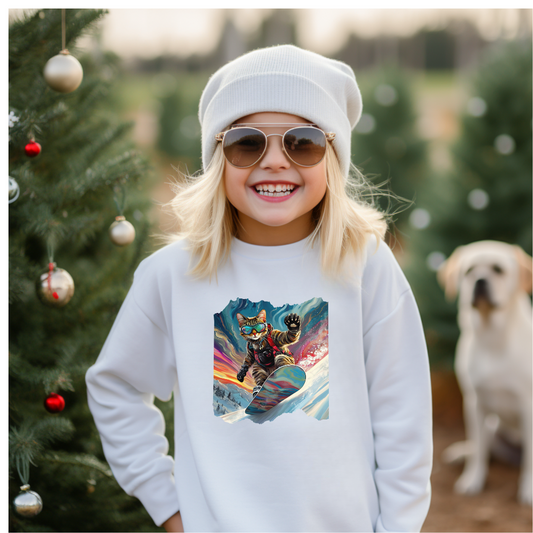 Shredding Snowboard Cat for Kids Sweatshirt - Colorful Snowboard Kitty, Kids Youth Crewneck Sweatshirt