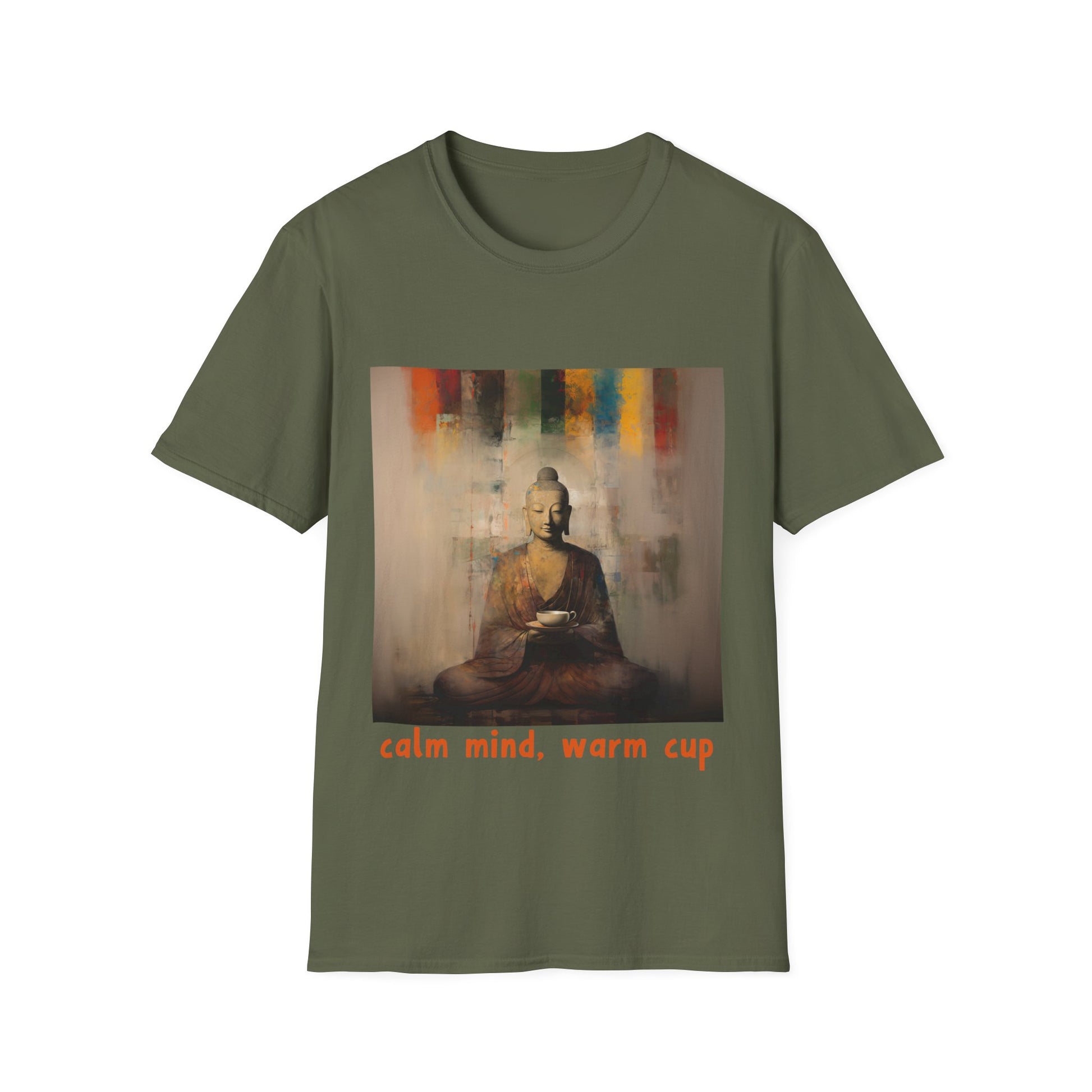 Calm Mind, Warm Cup Coffee Lover Peace Gift, Zen Coffee Buda Buddha Budda Unisex Jersey Short Sleeve Tee Shirt, Softstyle T-Shirt Men Woman