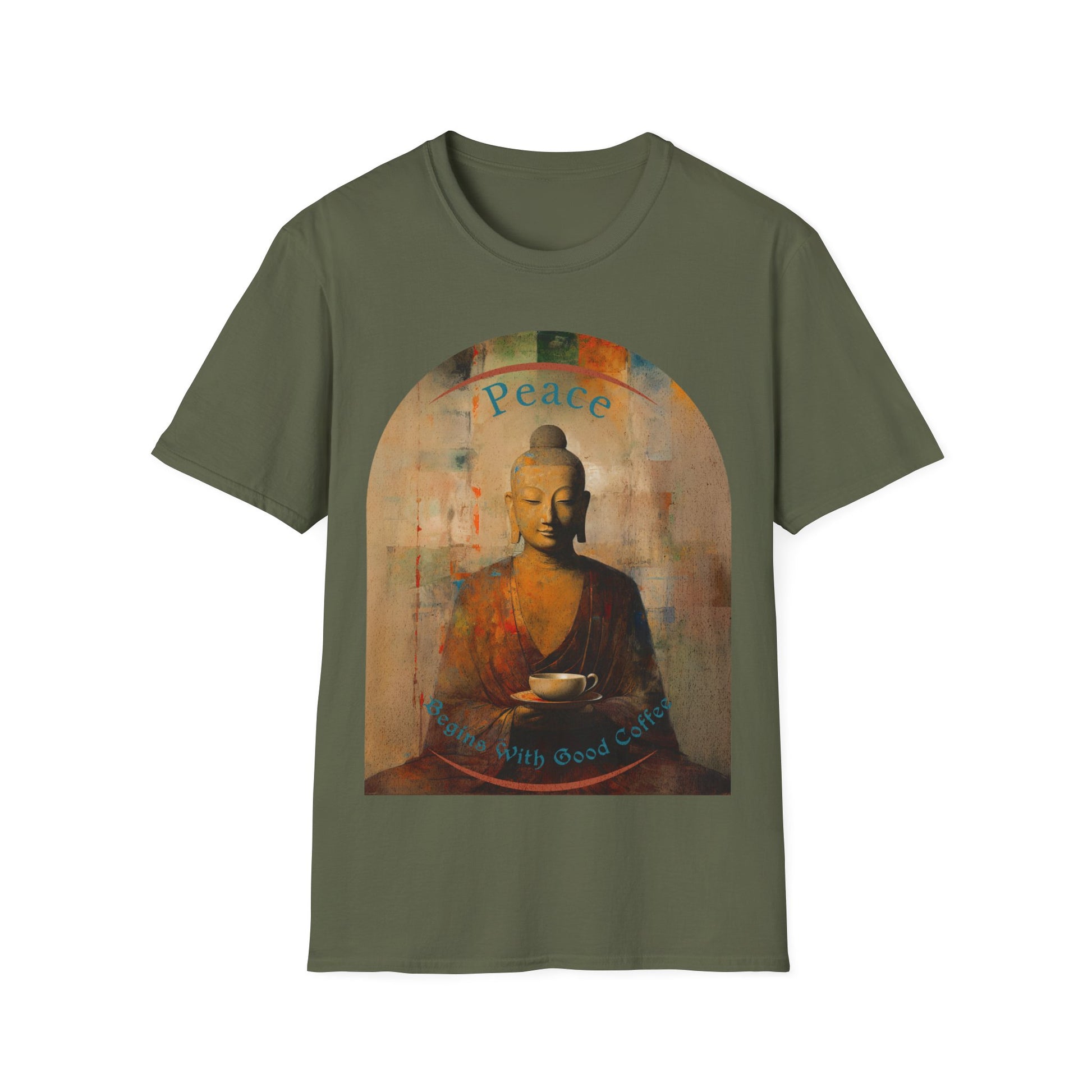 Coffee Lover Peace Gift, Peace Begins with Good Coffee Buda Buddha Budda Unisex Jersey Short Sleeve Tee Shirt, Softstyle T-Shirt Men Woman