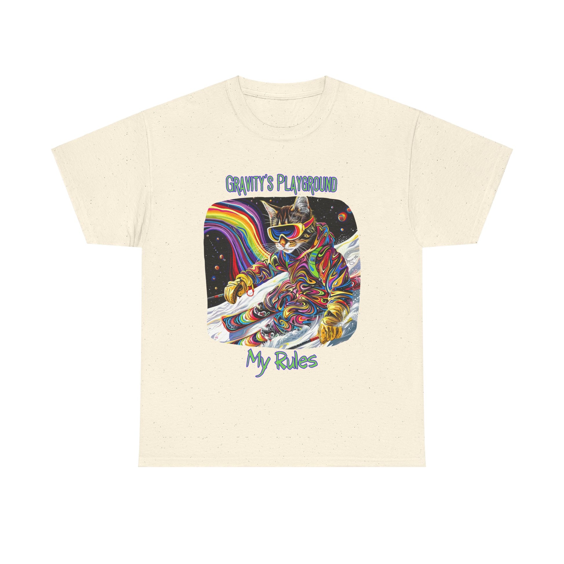 Gravity's Playground, My Rules - Ski, Snow, Snowboard Winter Sports Cat - Cat Graphic Tee Art Gift - Cool Cats Unisex Heavy Cotton Tee T-Shirt